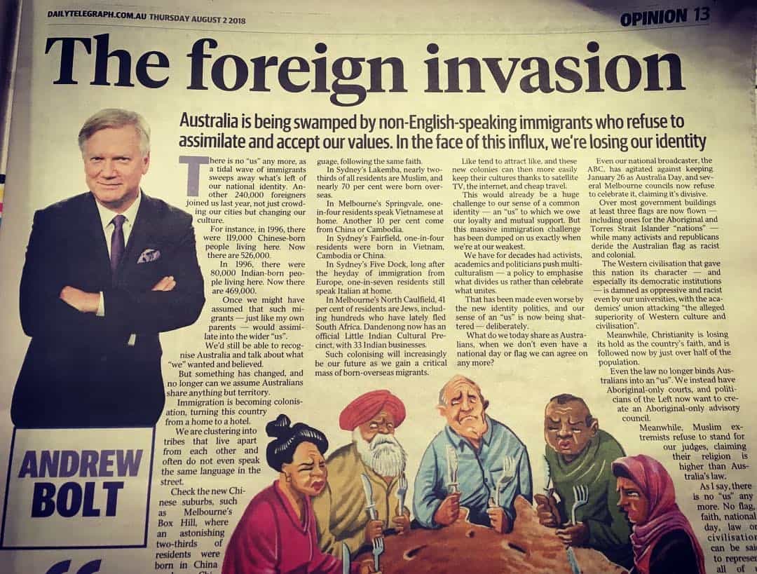 The opus to intolerance, division and a smattering of good old left/right divide subterfuge, is little more than an ode to how things might have been if we had kept the White Australia policy enacted. In his deep yearning for ‘the good old days’, Bolt earnestly declares, ‘there is no “us” anymore – or soon won’t be.”