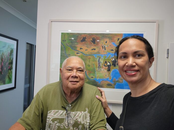 Born in Port Hedland, during World War II, Fabian’s early life was marked by displacement as his family was evacuated from Jirr’ ngin-ngan-Broome in the Djukun language. They returned after the war, bringing Fabian back to his roots, where his connection to the land and his culture deepened. His father, an Indonesian hard-hat diver, and his mother, a Djukun woman, instilled in him a profound respect for both his cultural heritage and the land of Jirr’ ngin-ngan.