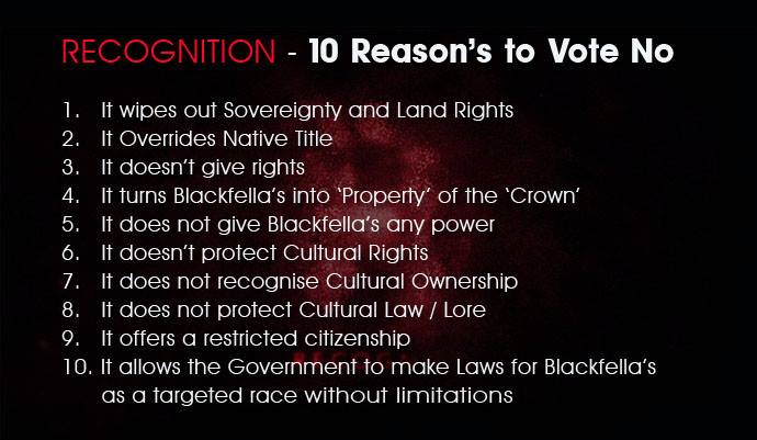 Blackfellas aren’t exempt from the predicament either. The issue of constitutional reform to recognise First Nations people springs most immediately to mind. Surprisingly for middle White Australia, the issue is a divisive one within the Indigenous public sphere. The reasons for this are complex. Principle among them for many grassroots Blackfellas is the lack of voice afforded by the media to dissenting voices, while the government sponsored publicity campaign known as Recognise received all the mainstream media focus as well as tens of millions of dollars to facilitate a Yes vote in some undetermined, but nevertheless impending referendum. That disregard prompted Aboriginal administrated oppositional groups to form on social media platforms, and chiefly Facebook, under banners such as Vote ‘NO’ To Constitutional Change, Say NO to Constitutional Recognition, Anti Recognise Campaign, and Australians against Aboriginal Racism and Forced Land Acquisition.