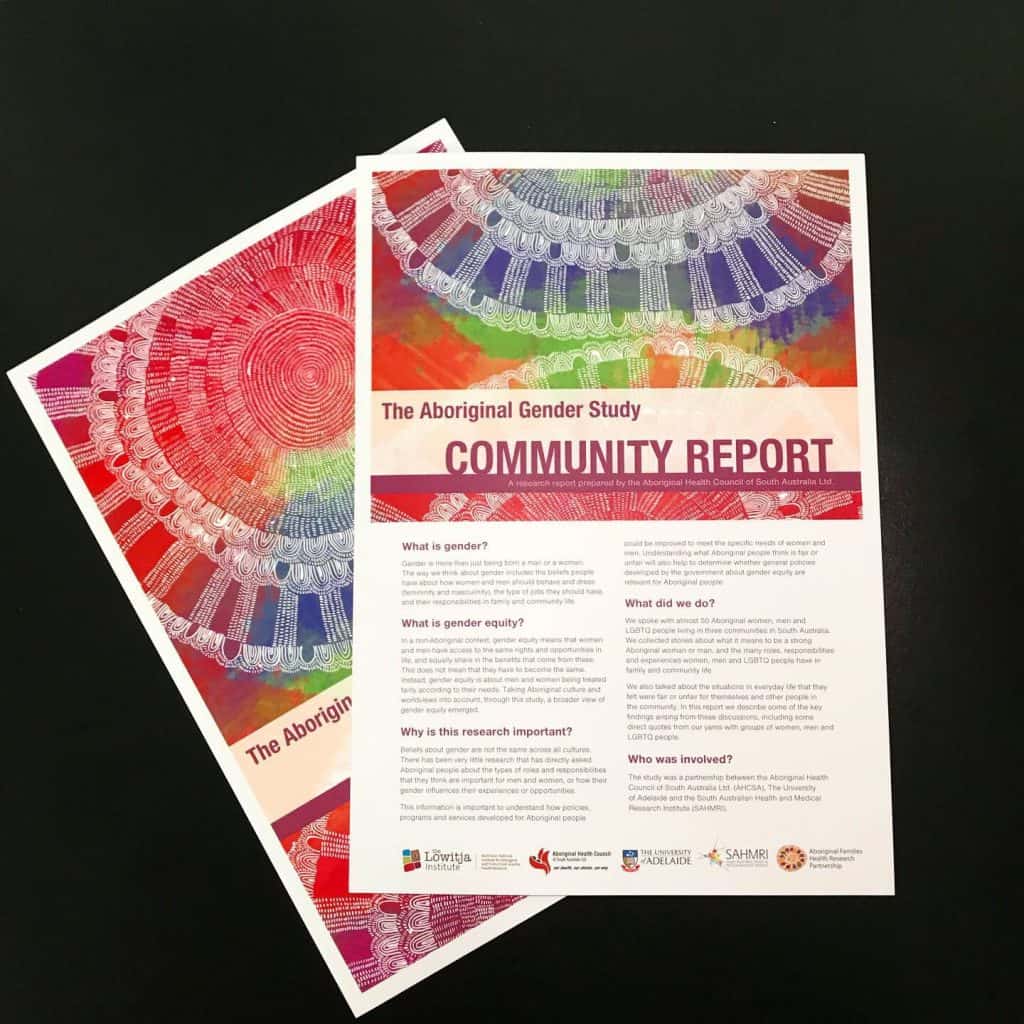 To counteract this, the ‘Aboriginal Gender Project’ was designed to explore contemporary understandings of gender and gender equity in Aboriginal communities. The project was established as a partnership between the Aboriginal Health Council of South Australia (AHCSA), University of Adelaide and South Australian Health and Medical Research Institute (SAHMRI) and was funded by the Lowitja Institute.