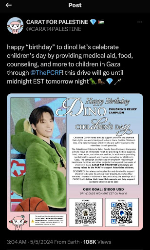 My favourite community action taken by Carats was a fundraiser for Korean Children’s Day. Seventeen, for years, has made jokes about Children’s Day being the birthday of their youngest member, Dino. While many outside of Seventeen’s fandom have fallen for this prank, this year, a twitter account called ‘Carats4Palestine’ used the in-joke to fundraise for Palestinian Children. Dino’s Birthday Fundraiser successfully raised over $1000 USD. Unfortunately since the event, the account briefly deactivated for safety reasons and has since gone private after being attacked by Zionist twitter users, but the good work the account did cannot be undone.