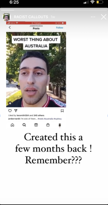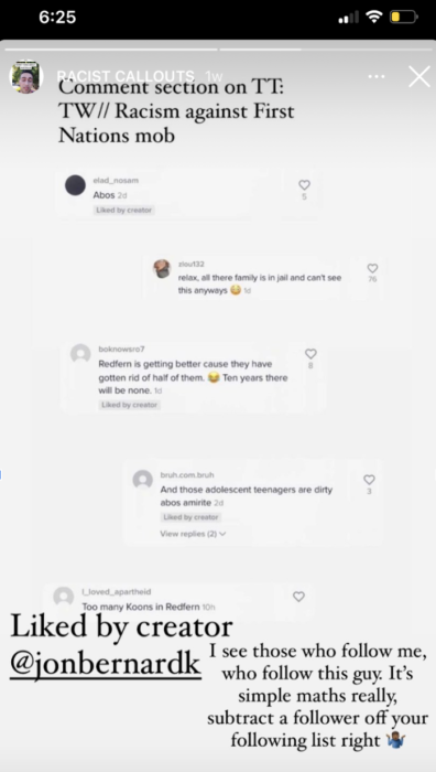 Through a series of Instagram posts, user Balaluke called out Jon-Bernard by posting a video in which “TikTok Guy” joked that the problem with Redfern, and the wider community, was Aboriginal People. In the video, he corrects himself and says adolescents on the second clip, possibly in a way to avoid direct controversy. However, doubled down on this racism by liking racist comments, with some simply stating “Abos.”