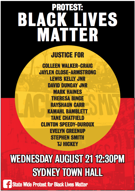 Next Wednesday 21 August, more than 12 families and our supporters will march from Sydney Town Hall to NSW Parliament house at 12.30pm to protest the murders of our loved ones, and demand action from the NSW Justice Department. We are fighting a battle that has been waged since Invasion in 1788.