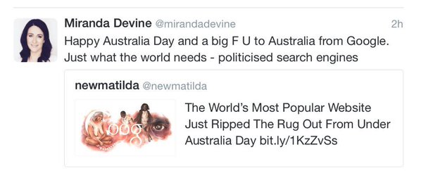 Today on twitter there was much talk about the recycled Google doodle, a drawing of Aboriginal people made by a young non-Aboriginal woman that when you clicked on it took you to a Google search of ‘Australia Day’. A fairly subtle point from Google that Aboriginal people exist. Some took it as a gesture of polite protest. Some took it as a gesture of respect. Some people on Facebook questioned why it was a non-Aboriginal artist who won the competition, and others questioned the outcome that when you clicked on it the search didn’t really tell you anything about Aboriginal people (that in itself carries significance). One right wing columnist however, decided that it was a “F U to Australia” from Google and condemned having such ‘politicised search engines”. The comments were pretty funny given who said them, but it made me remember an article about some of the backlash from this year’s lamb ad where it said that “[Sam] Kekovich said he wanted to keep the conversation around Australia Day free from politics”… then I remembered another quote “Just being Aboriginal is a political statement” (if you know who to attribute for this, please let me know!).