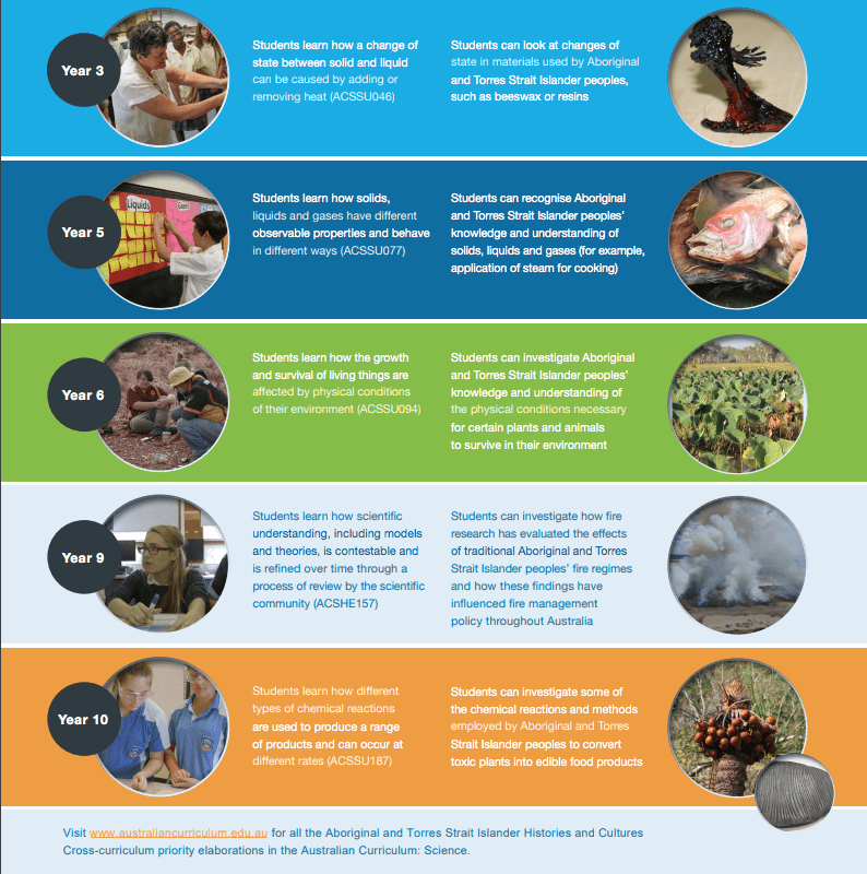 In November this year, over 90 elaborations were released for the Science curriculum that can be used to teach essential content in the Science curriculum. This sends a clear message that Aboriginal and Torres Strait Islander cultures are relevant, and are sophisticated and applicable to a “modern” Science curriculum including areas such as chemistry and physics.
