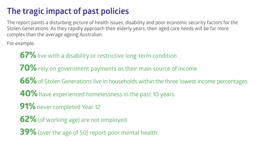 The report states that two-thirds of the Stolen Generations were aged 50 and over in 2015 and that within five years they will all be eligible for aged care. This statistic alone should ring alarm bells. The data shows that Stolen Generations aged care needs are far more complex than the average ageing Australian.