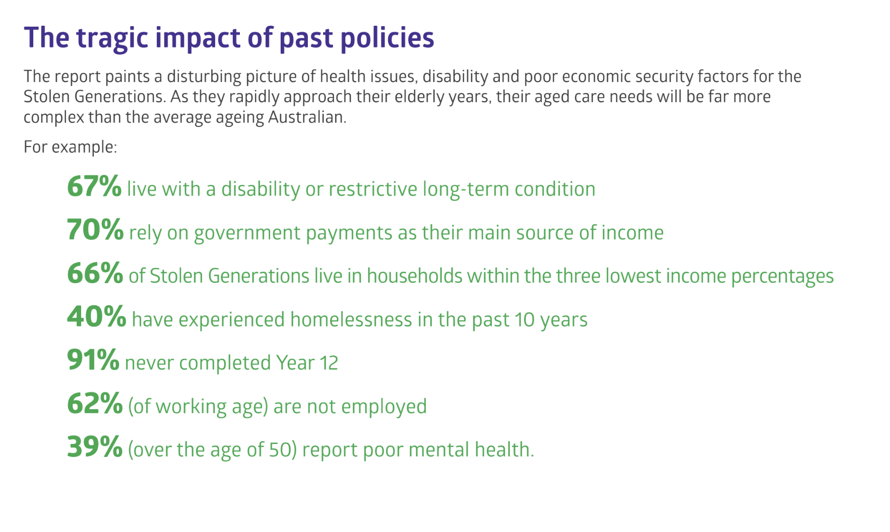 For example, almost 40 per cent of Stolen Generations over 50 have poor mental health and close to a third (29%) live alone, while only a quarter own their home. Two-thirds (67%) live with a disability, and they are also more likely to experience health problems, including heart disease and stroke.