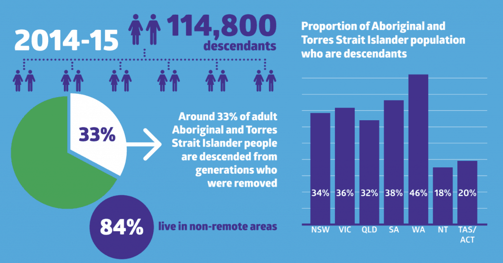 And we now know that about one third of today’s adult Aboriginal and Torres Strait Islander population are descendants of Stolen Generations members. Importantly, the report also shows that the descendants consistently experience poorer health and social outcomes. They are twice as likely to have experienced violence and 1.3 times as likely to report poor mental health, compared with other Aboriginal and Torres Strait Islander people.