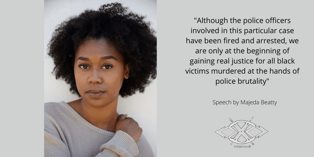 My name is Majeda-Mo’ Tapalinga Beatty and I acknowledge the traditional custodians of the land and pay my respects to the elders past, present and future for they hold the memories, traditions, cultures and hopes of Indigenous Australia. I would like to acknowledge the other Aboriginal people and Torres Strait Islander people here today. My mother is an Aboriginal woman; we are Kuku Yalanji, (and) Wuthathi from far north Queensland, Torres Strait Islander… Torres Strait Islander from Moa and Darnley. My father is a Black American man from the City of New York.