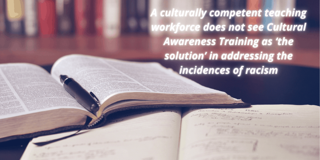 A culturally competent teaching workforce does not see Cultural Awareness Training as ‘the solution’ in addressing the incidences of racism.  Because we all know, engrained racism embedded and normalised within the Australian social psyche cannot be resolved with a day’s training that staff are mandatorily made to attend.