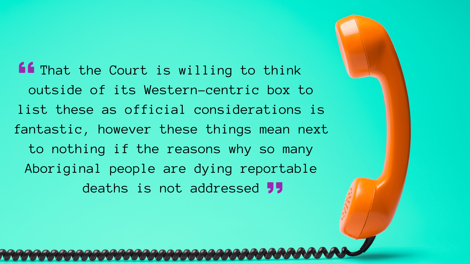 Of course, this is not to dismiss or discredit the incredible work that Troy Williamson and others have done and continue to do to make this system a safer one for mob. The other states and territories should sit up and take notice of the work that Victorian Coroners Court is doing in this space. These changes, however flawed, must be applauded and recognised as a step in the right direction, changes that have real potential to change interactions with the Coroners Court for the better.