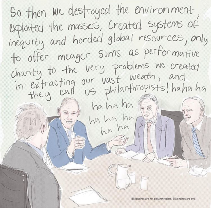 Perhaps philanthropy is aptly summarised through this anonymous quote: “so then we destroyed the environment, exploited the masses, created systems of inequity and hoarded global resources, only to offer meagre sums as performative charity to the very problems we created in extracting our wealth, and they call us philanthropists.”