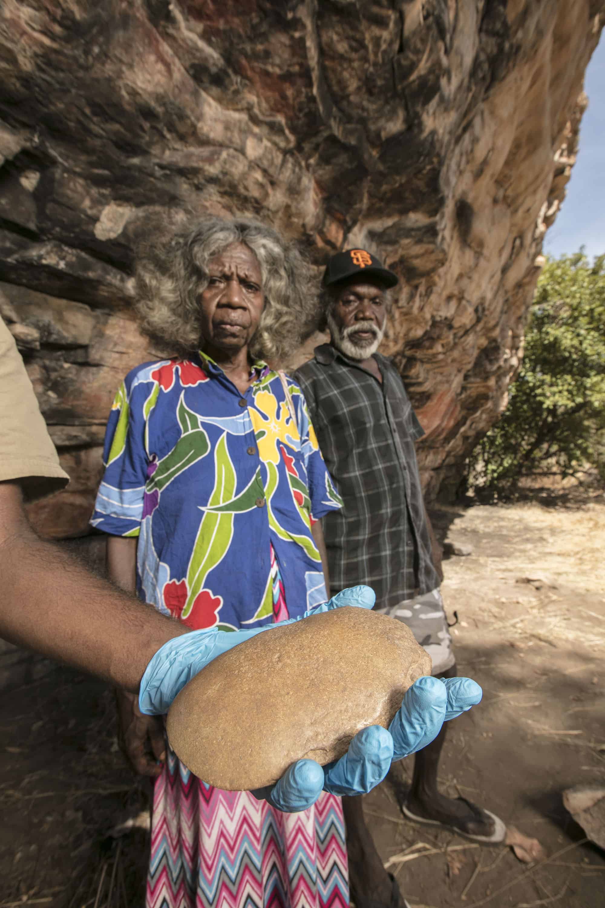 Image: May Nango and Mark Djanjomerr inspect one of the artefacts uncovered at the Madjedbebe site. Photo: Glenn Campbell.