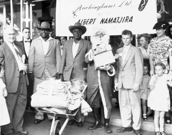 Image: Albert Namatjira and Keith Namatjira in front of the Buckingham’s Department Store, Sydney. Source: National Library of Australia.