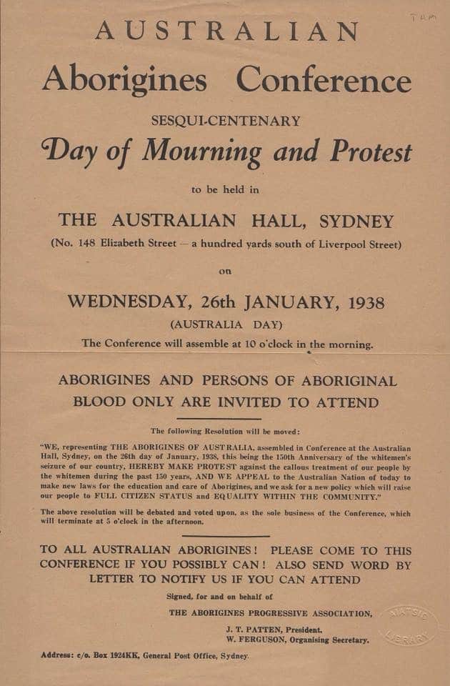 “WE, representing THE ABORIGINES OF AUSTRALIA, assembled in conference at the Australian Hall, Sydney, on the 26th day of January, 1938, this being the 150th Anniversary of the Whiteman’s seizure of our country, HEREBY MAKE PROTEST against the callous treatment of our people by the whitemen during the past 150 years, AND WE APPEAL to the Australian nation of today to make new laws for the education and care of Aborigines, we ask for a new policy which will raise our people TO FULL CITIZEN STATUS and EQUALITY WITHIN THE COMMUNITY.”
