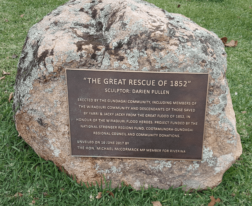 One such story is that of Yarri (Coonong Denamundinna), Jacky Jacky and other Wiradjuri men that rescued an estimated 69 people during the great flood of 1852, at Gundagai.