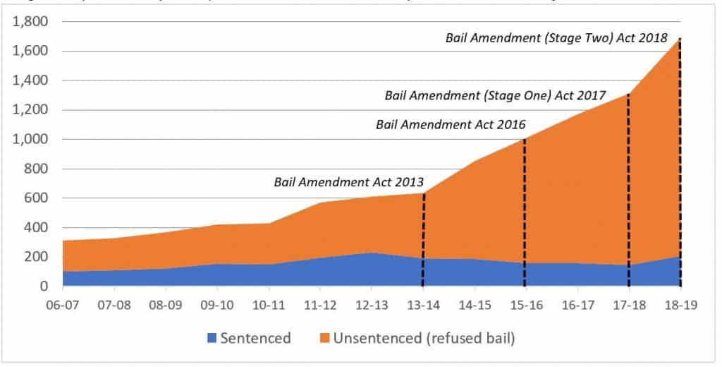 Indigenous prison receptions (sentenced and unsentenced) and selected bail reforms, Victoria