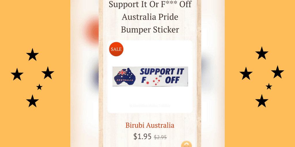 To add insult to injury, Ben Wooster’s previous business, the now-defunct Birubi Arts, was found guilty by the ACCC of misleading consumers. Wooster’s caper was importing Indigenous-style gifts and selling them as genuine Aboriginal arts. This is extremely unethical and according to Lorena Allam at The Guardian, the ACCC is seeking a 2-2.5m penalty because of their consumer law breach. A quick look around for Birubi online also showed me another site they are featured on where they are selling racist bumper stickers to rednecks. WAM have made a lot of noise in the last week or so about their respect for Aboriginal people, art and culture, but apparently not enough to be above selling racist shit to racists and profiteering off art and culture at the same time.