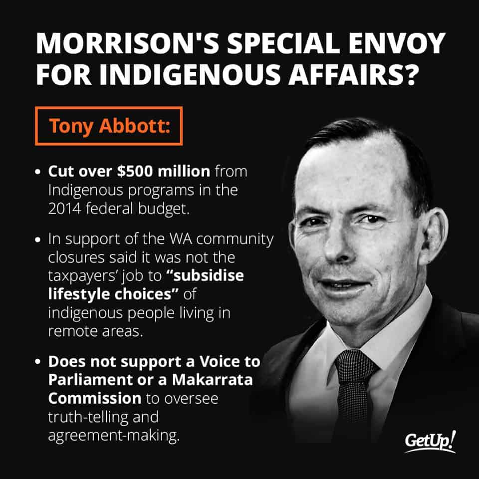 In case you forgot, Tony Abbott was responsible for disbanding a wide array of Indigenous advisory groups which he replaced with his handpicked ‘PM’ advisory group. He took over half a billion dollars out of the Indigenous Affairs budget with no real planning or reflection. He spoke of invasion as a ‘form of British investment’, and of Australia as being ‘nothing but bush’ before 1788. He also expressed his belief that invasion and the ongoing colonisation was a good thing to have happened to Indigenous people. He was the mastermind behind the failed Recognise campaign, and supports only minimalist recognition of Indigenous peoples. He does not support a treaty/makarrata, or even a Voice to Parliament. He supported the closure of remote communities calling them subsidised ‘lifestyle choices’, and has a long history of opposing native title and land rights.  Ot only did he champion the attacks of 18C, but there was even a story at the time that claimed after Andrew Bolt fell afoul of 18C with his series of factually inaccurate racially vilifying articles attacking Indigenous people, that Tony Abbott begged him to keep writing – and that’s what I can remember off the top of my head, I’m sure there are countless other things that deserve being mentioned in that list.